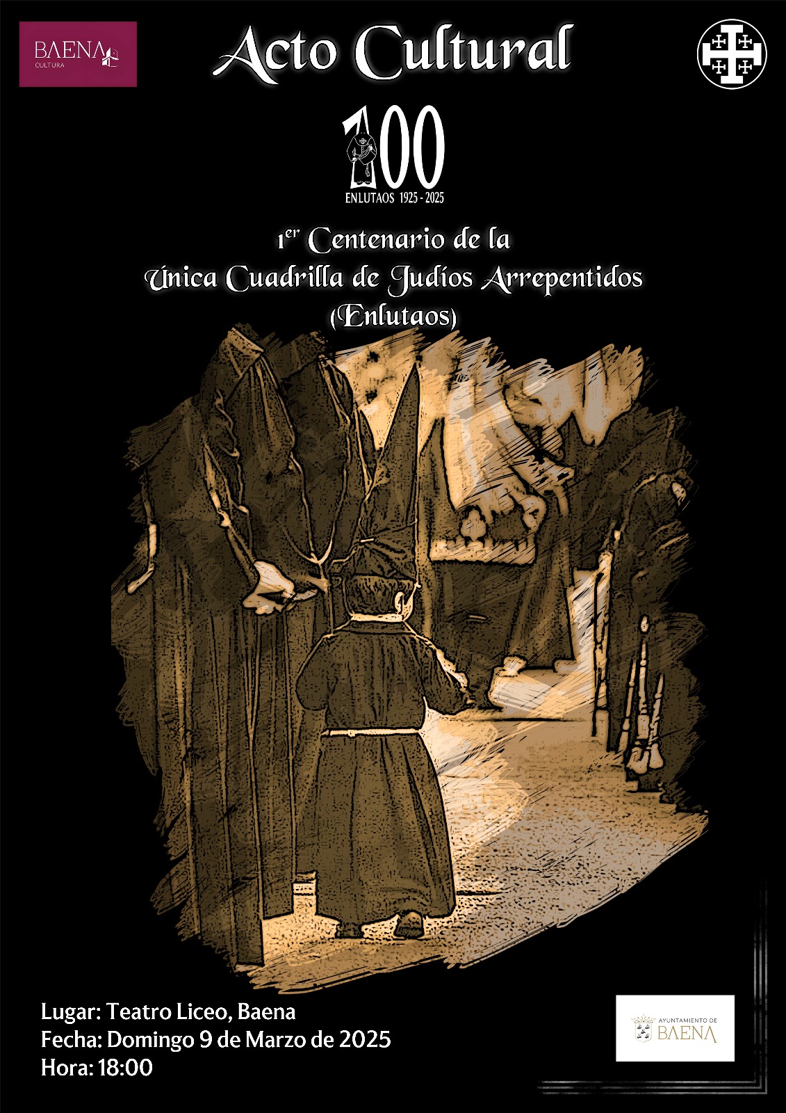 La Única Cuadrilla de Judíos Arrepentidos (Enlutaos), celebrará, en el teatro Liceo, a las 18:00h del próximo domingo 9 de marzo, un acto cultural por la celebración de su 1º Centenario.